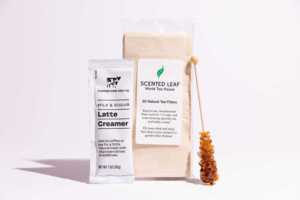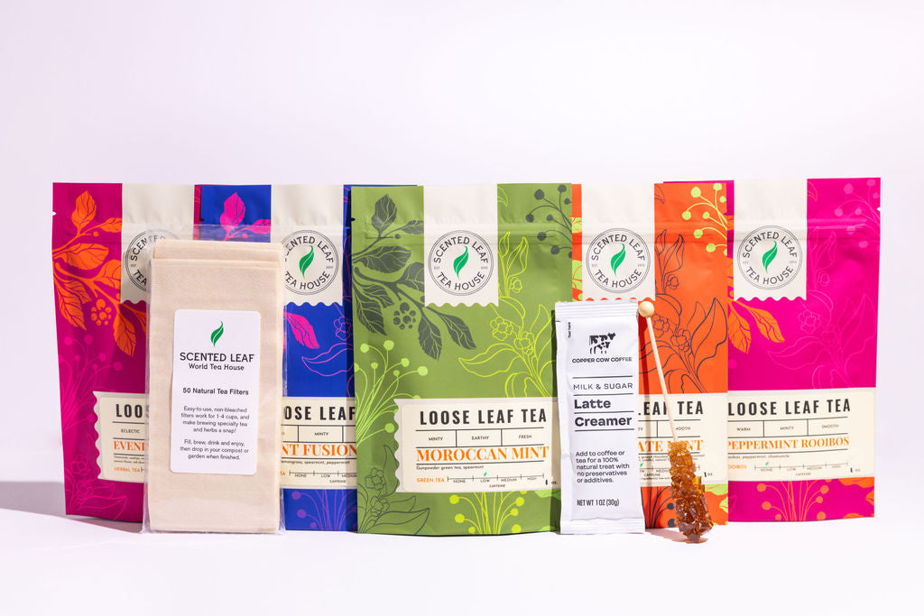 This Tea sampler contains five 1 oz bags of “minty” loose leaf tea, a 50-pack of natural filters, and some other goodies to get you started.